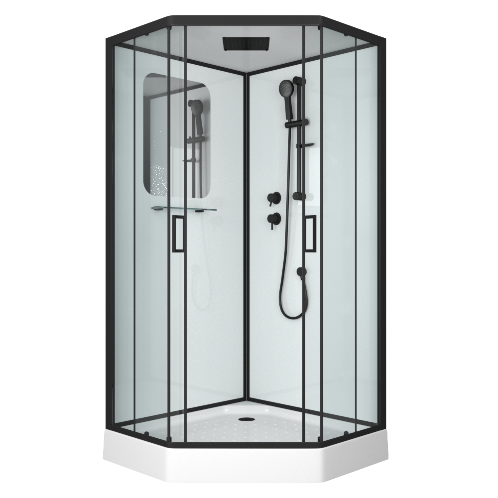 Комплектация: Сифон, тропический душ, шланг душа, штанга, полочка, зеркало, ролики, смеситель.