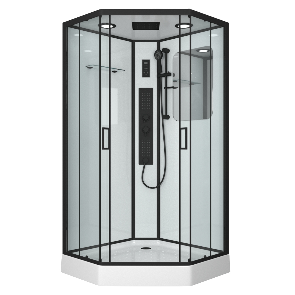Комплектация: Сифон, тропический душ, шланг душа, штанга, полочка, зеркало, ролики, смеситель, гидромасаж, панель управления.