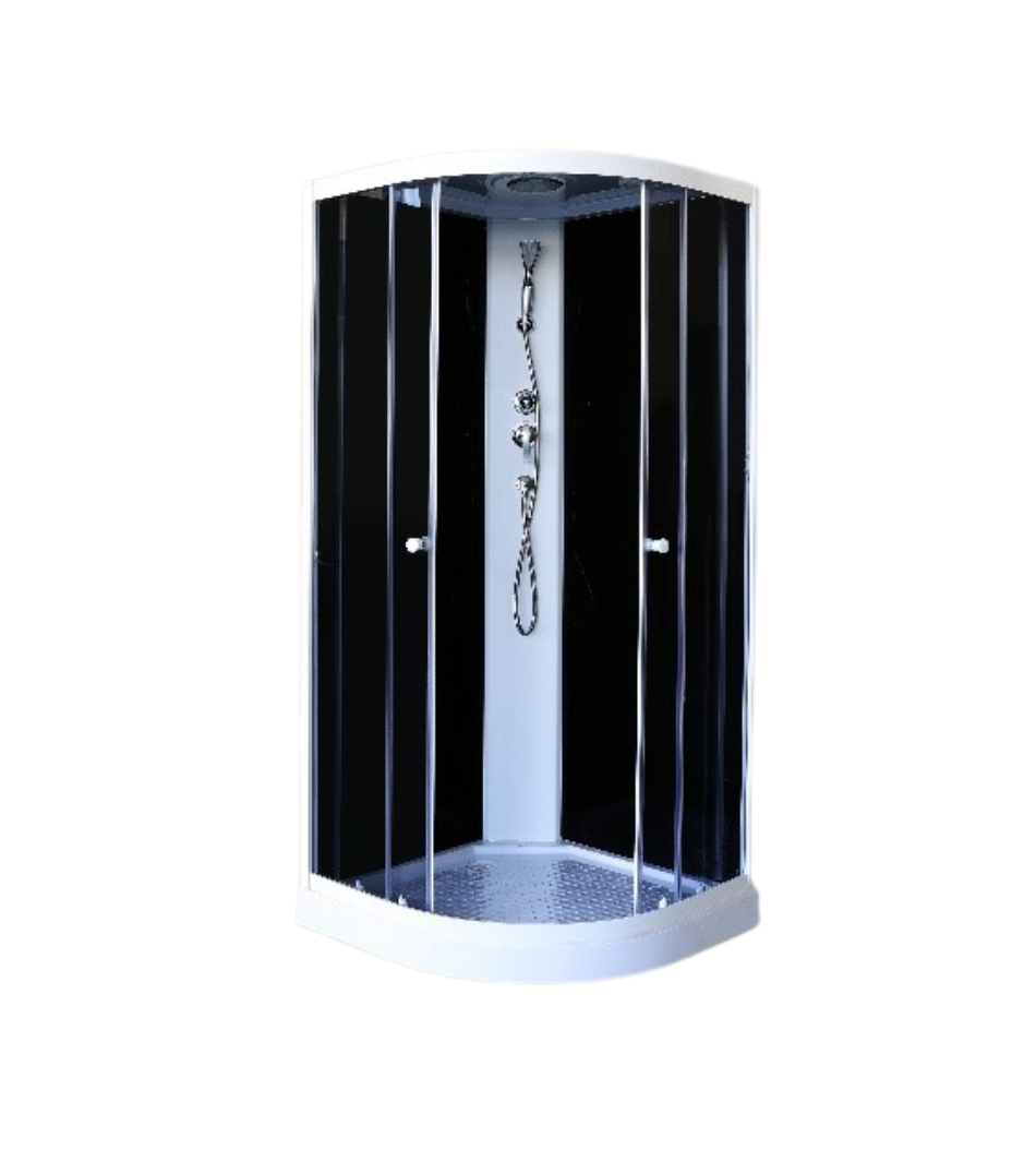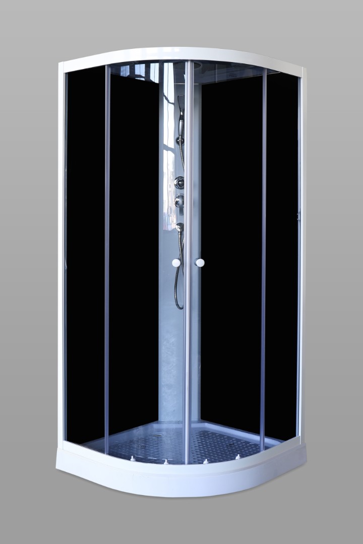 Душевая кабина с низким поддоном. Внутренняя площадь позволяет с комфортном принимать водные процедуры, не задевая локтями ограждение. Внутри кабины хорошо сохраняется тепло, модель герметична, вода сквозь стыки наружу не просачивается. Достоинства: Стекло: тонированное, 4 мм. Закаленное полотно практически невозможно разбить. В случае битья стекло рассыпается на множество граней с тупыми концами, о которые невозможно пораниться. Стенки: закаленное черное стекло, 4 мм. Профиль: белый, алюминиевый. Профиль не деформируется при перепадах температуры и устойчив к образованию коррозии. Центральная панель белая, в которую возможна установка сенсорного пульта. Поддон: низкий, 10 см, полукруглый. Материал - АВS. Рельефное дно предупреждает падения. Комплектация: верхний душ ТРОПИК, ручной душ, сифон. Раздвижные двери смыкаются плотно. Створки ходят плавно, не заедают.