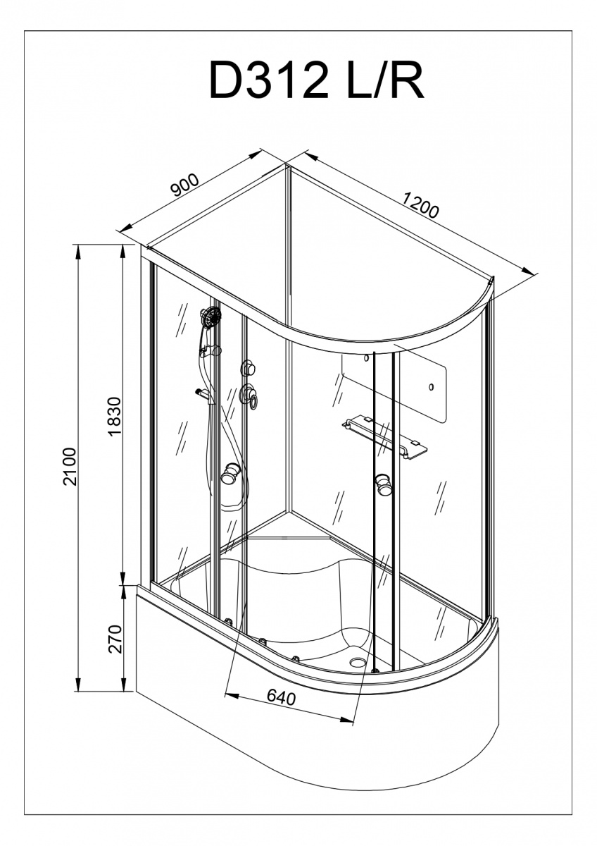 Стильная душевая кабина с внутренней сборкой AvaCan D312 L сочетает в себе высокую функциональность, практичность и надежность. Для изготовления применяют безопасное закаленное стекло толщиной 4 мм, надежно фиксируемое алюминиевым профилем. Цвет профиля хром. В комплекте сифон, полочка, зеркало,  смеситель, переключатель режимов, передний съемный экран, душевой гарнитур.