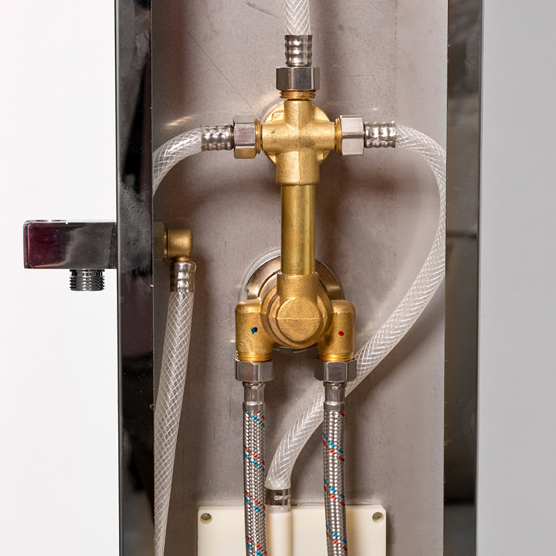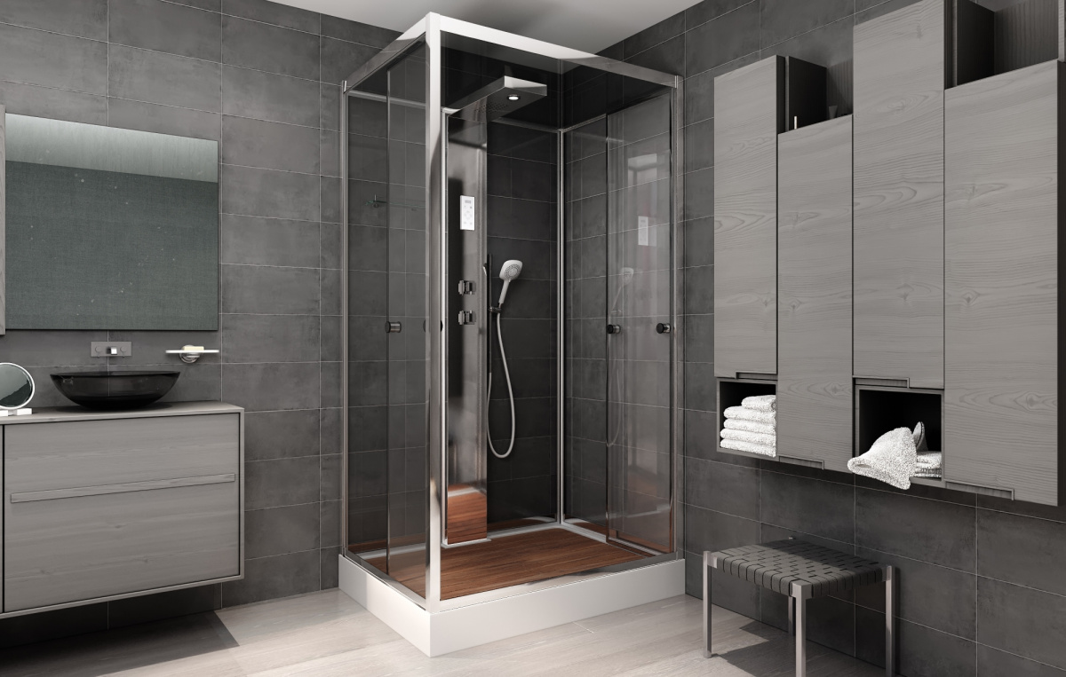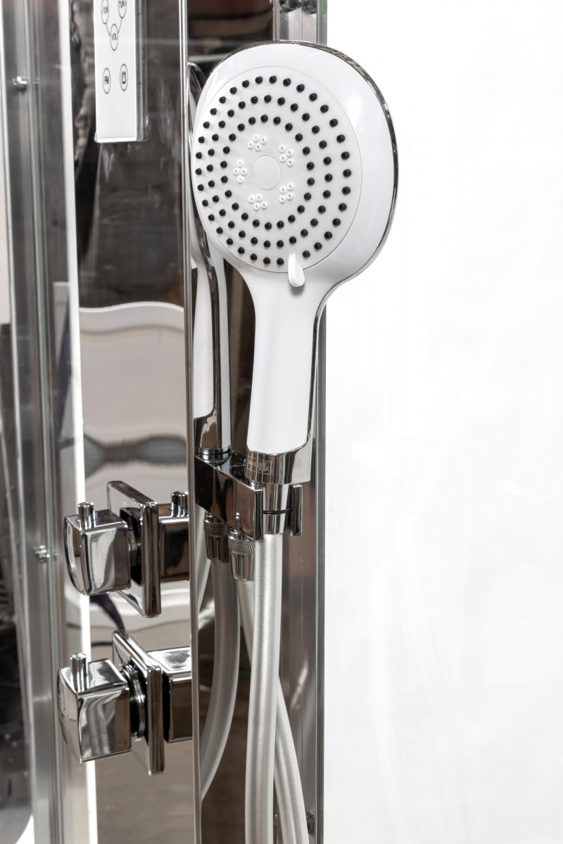 Стильная душевая кабина с внутренней сборкой  AvaCan Z122 Espoo сочетает в себе высокую функциональность, практичность и надежность. Для изготовления применяют безопасное закаленное стекло толщиной 6 мм, надежно фиксируемое алюминиевым профилем.Крыша и задние стекла матовые. Цвет профиля хром. В комплекте душевой гарнитур, тропический (верхний) душ, гидромассажные форсунки, деревянная вставка в поддон.
