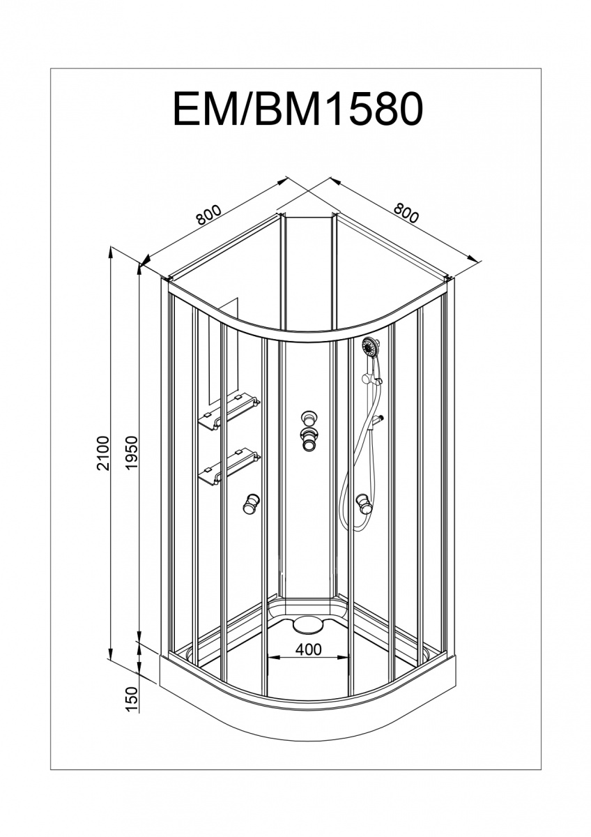 Стильная душевая кабина AvaCan EM 1580 N сочетает в себе высокую функциональность, практичность и надежность. Для изготовления применяют безопасное закаленное стекло толщиной 5 мм, надежно фиксируемое алюминиевым профилем. Цвет профиля белый. В комплекте зеркало, душевой гарнитур, переключатель режимов, смеситель,  деревянная вставка в поддон, полочки,