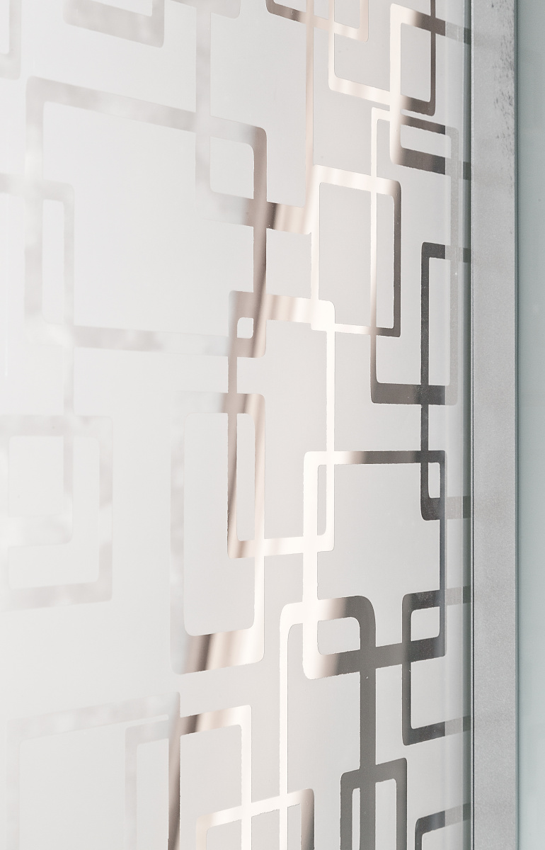 Закаленные, ударопрочные стекла 5 мм с уникальным матовым рисунком, спереди;