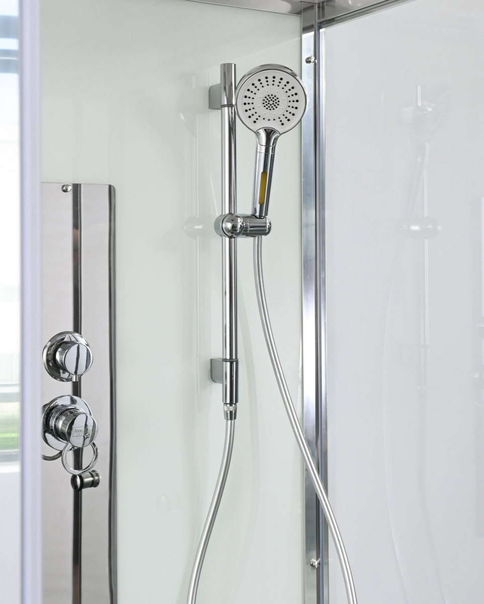 Стильная душевая кабина AvaCan сочетает в себе высокую функциональность, практичность и надежность. При изготовлении применяется безопасное закаленное стекло, надежно фиксируемое алюминиевым профилем. Профиль сделан из алюминия повышенной прочности. Сборка без силикона (увеличивает срок службы, защищает от протечек), внутренняя сборка (облегчает установку и ревизию; позволяет установить в ограниченном пространстве и обойтись без демонтажа других сантехнических приборов), смеситель резьбовой (без хомутов). Двойные металлические ролики дверей (распределение нагрузки на два ролика, увеличивают срок службы). Душевая штанга(позволяет регулировать по высоте ручную лейку), ручная арома-лейка с витамином С (картридж в комплекте,есть возможность замены или удаления картриджа), полочки(из стекла, с ограничителем), сифон с гидрозатвором.