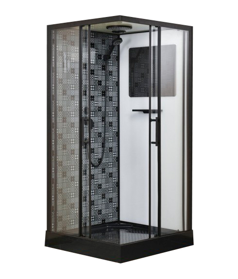 Поддон, крыша, сифон с выпуском, полочка, стакан, смесительный узел с дивертором, зеркало, душевая лейка, душевой шланг, штанга для душа, шланговое подключение, набор крепежа, инструкция