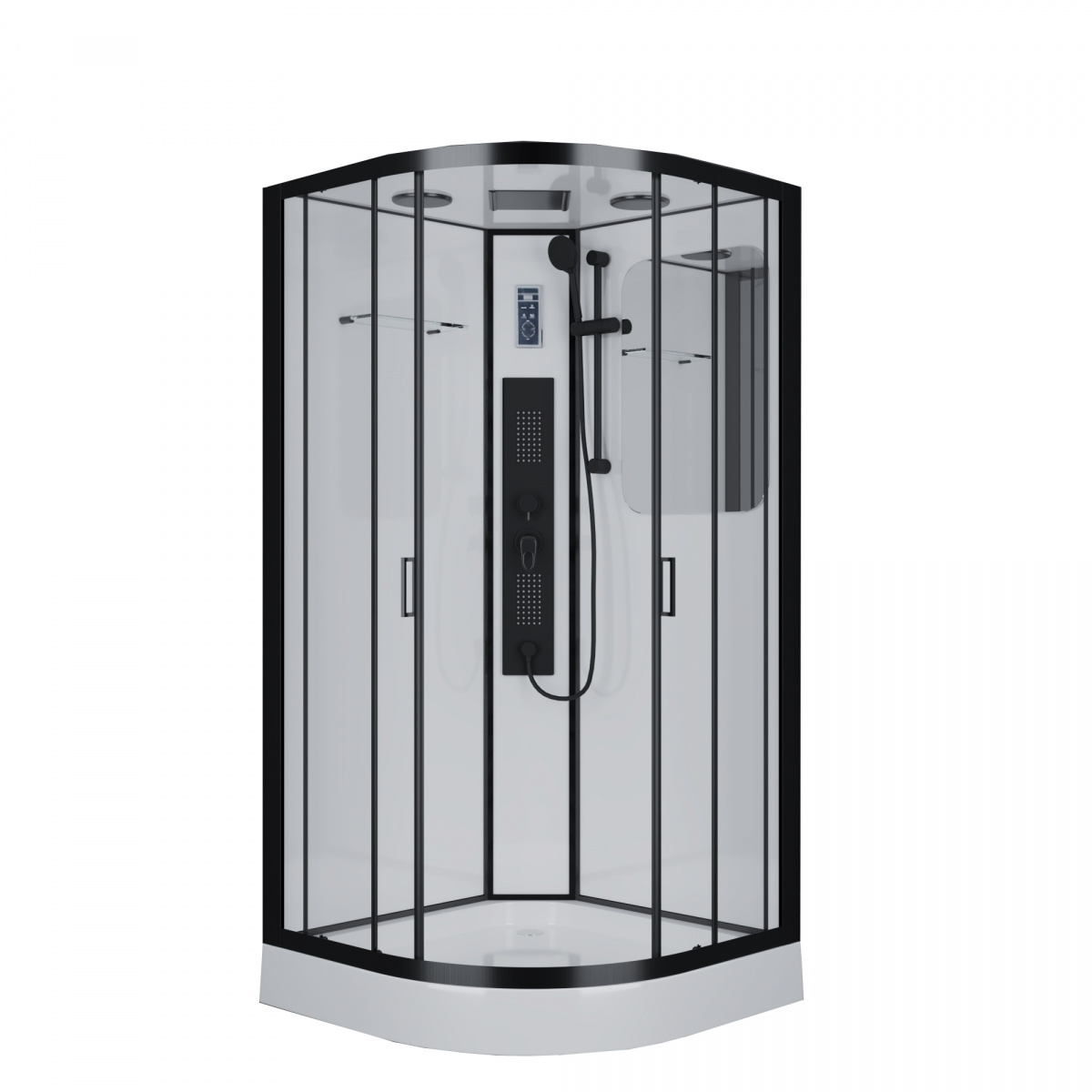 Комплектация: Сифон, тропический душ, шланг душа, штанга, полочка, зеркало, ролики, смеситель, гидромасаж, панель управления.