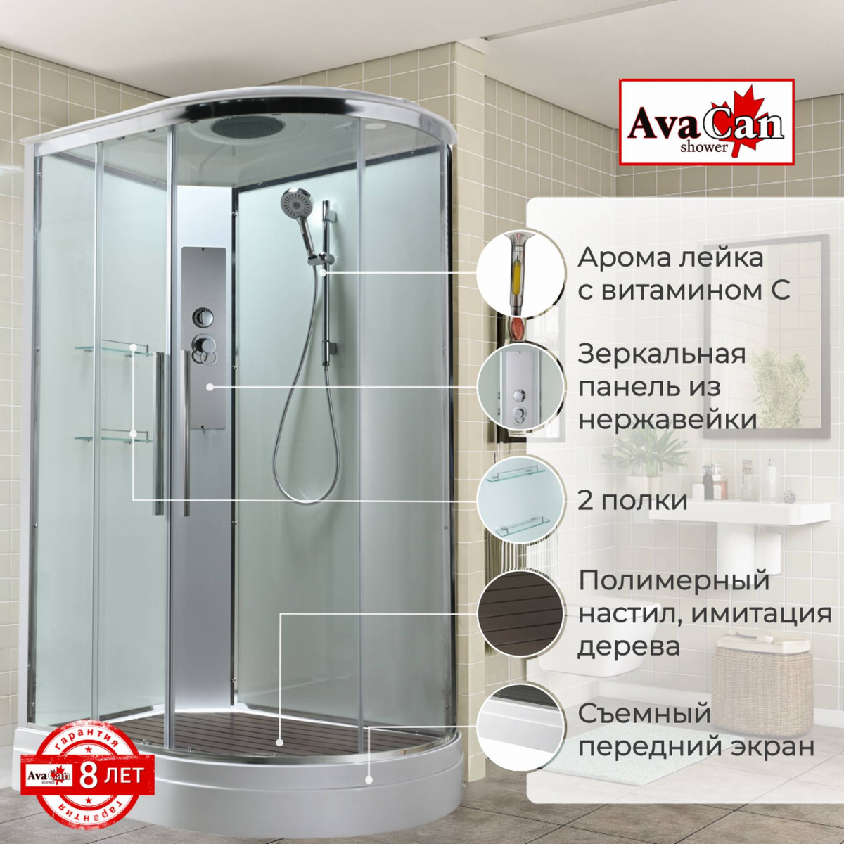 Стильная душевая кабина AvaCan EM2811LT сочетает в себе высокую функциональность, практичность и надежность. При изготовлении применяется безопасное закаленное стекло толщиной 5 мм (прозрачное), надежно фиксируемое алюминиевым профилем. Сборка без силикона (увеличивает срок службы), внутренняя сборка(облегчает установку и ревизию; позволяет установить в ограниченном пространстве), смеситель резьбовой (без хомутов). Съемный экран поддона (позволяет осуществлять ревизию сифона). Цвет профиля  хром. Двойные металлические ролики дверей (увеличивают срок службы).В комплекте : душевая штанга, две полочки , тропический (верхний) душ, арома-лейка с витамином С (картридж съемный),полимерная вставка в поддон(имитация дерева),сифон, ручки дверей из нержавейки , двойные ролики .