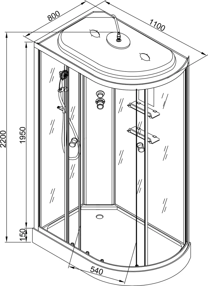 Стильная душевая кабина с внутренней сборкой AvaCan EM 1511 L сочетает в себе высокую функциональность, практичность и надежность. Для изготовления применяют безопасное закаленное стекло толщиной 5 мм, надежно фиксируемое алюминиевым профилем. Цвет профиля хром. В комплекте зеркало, переключатель режимов, смеситель, тропический (верхний) душ, полочки, тропический (верхний) душ,вставка в поддон.