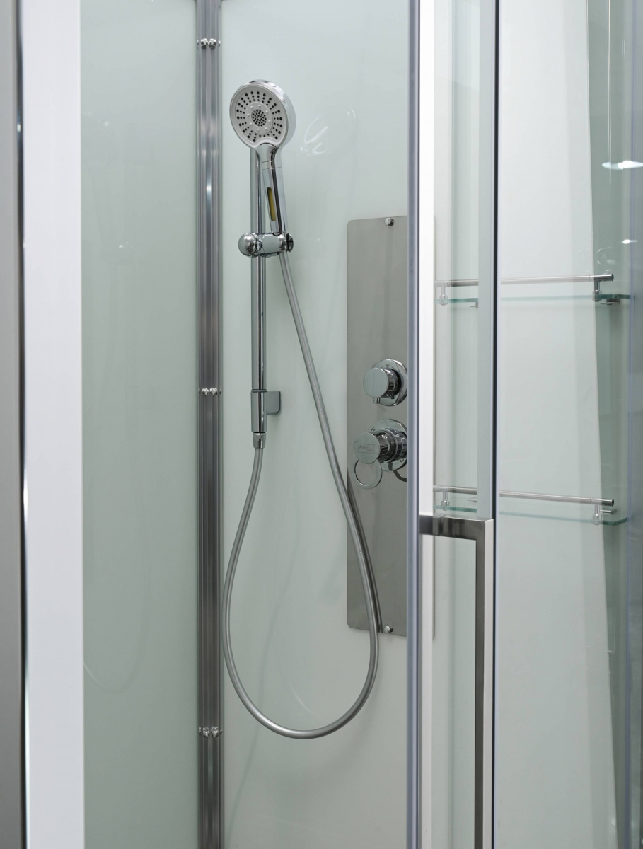 Стильная душевая кабина AvaCan сочетает в себе высокую функциональность, практичность и надежность. При изготовлении применяется безопасное закаленное стекло, надежно фиксируемое алюминиевым профилем. Профиль сделан из алюминия повышенной прочности. Сборка без силикона (увеличивает срок службы, защищает от протечек), внутренняя сборка (облегчает установку и ревизию; позволяет установить в ограниченном пространстве и обойтись без демонтажа других сантехнических приборов), смеситель резьбовой (без хомутов).Двойные металлические ролики дверей (распределение нагрузки на два ролика, увеличивают срок службы). Душевая штанга(позволяет регулировать по высоте ручную лейку), ручная арома-лейка с витамином С (картридж в комплекте,есть возможность замены или удаления картриджа), полочки(из стекла, с ограничителем), сифон с гидрозатвором.