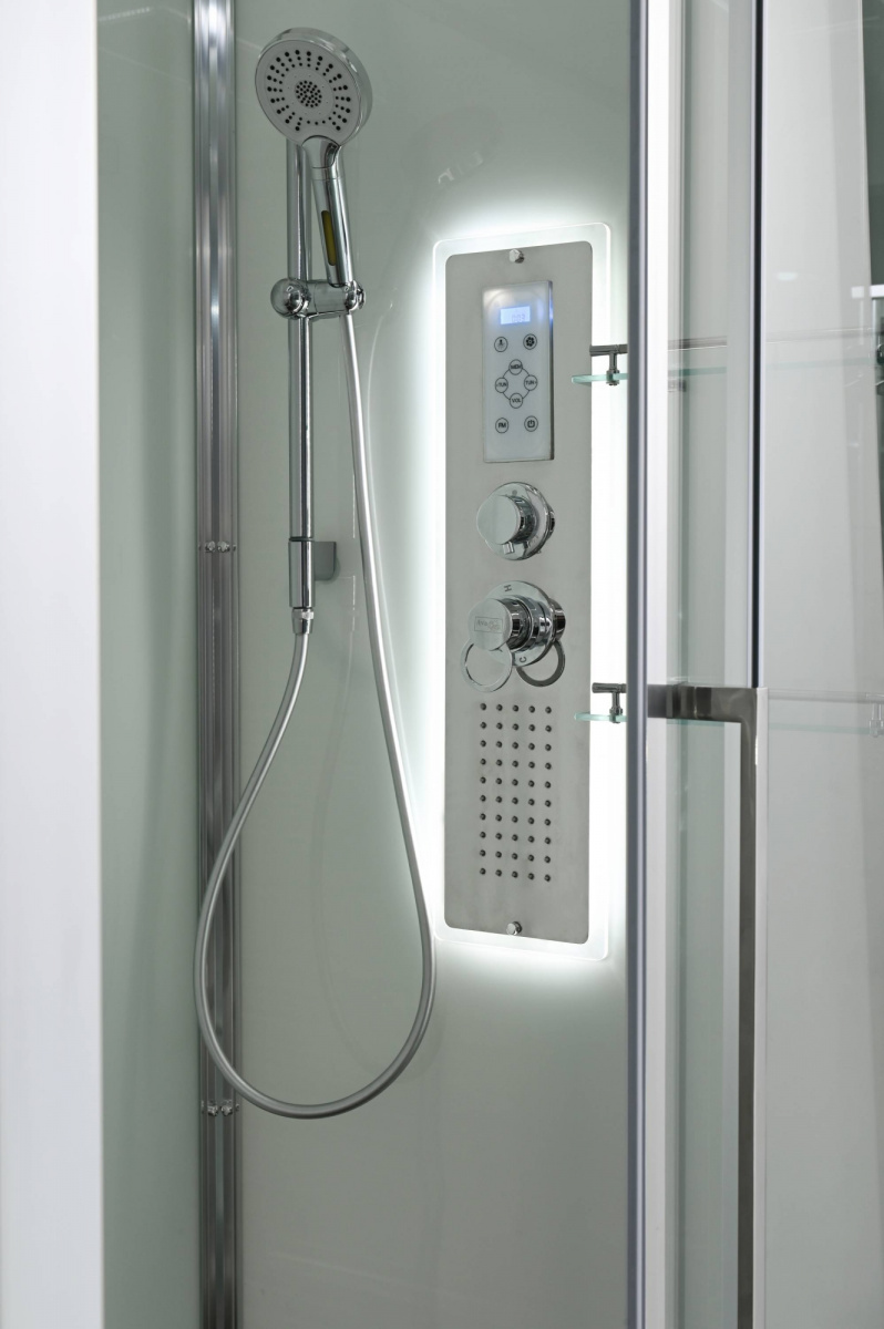 Стильная душевая кабина AvaCan сочетает в себе высокую функциональность, практичность и надежность. При изготовлении применяется безопасное закаленное стекло, надежно фиксируемое алюминиевым профилем.Профиль сделан из алюминия повышенной прочности. Сборка без силикона (увеличивает срок службы, защищает от протечек), внутренняя сборка (облегчает установку и ревизию; позволяет установить в ограниченном пространстве и обойтись без демонтажа других сантехнических приборов), смеситель резьбовой (без хомутов). Двойные металлические ролики дверей (распределение нагрузки на два ролика, увеличивают срок службы). Душевая штанга(позволяет регулировать по высоте ручную лейку), ручная арома-лейка с витамином С (картридж в комплекте,есть возможность замены или удаления картриджа), полочки(из стекла, с ограничителем), сифон с гидрозатвором, сенсорный пульт управления с функциями: блютуз, LED подсветка, радио, вытяжка, гидромассаж спины, тропический (верхний) душ.