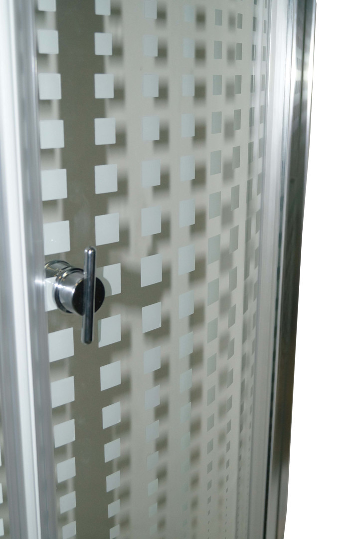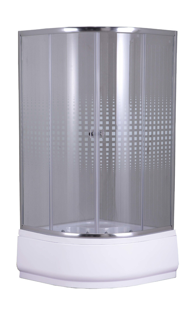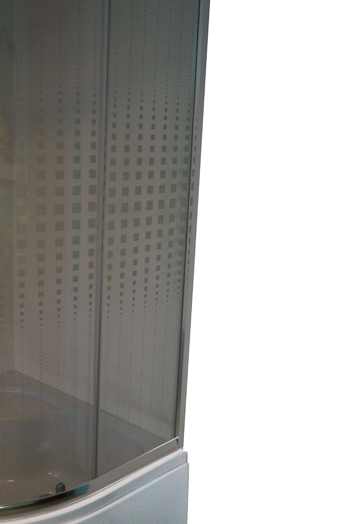 Тип: душевой уголок Стекло: 4 мм прозрачное закаленное с дизайнерским рисунком Профиль: полированный алюминиевый Поддон: высокий 42см, полукруглый Ролики: одинарные Сифон: в комплекте
