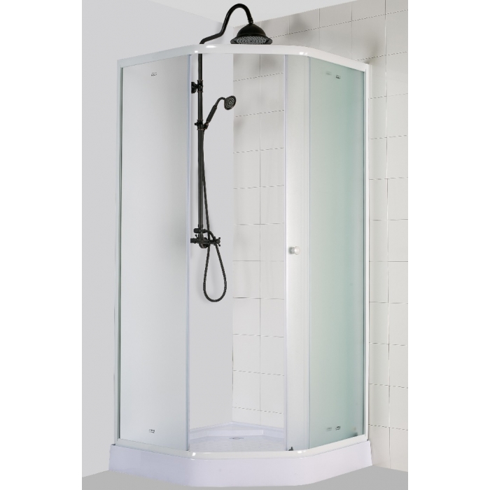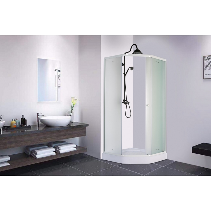 Тип: душевой уголок Стекло: 4 мм матовое закаленное Профиль: белый алюминиевый Поддон: низкий 10см, трапеция Сифон: в комплекте Особенность: раздвижные двери