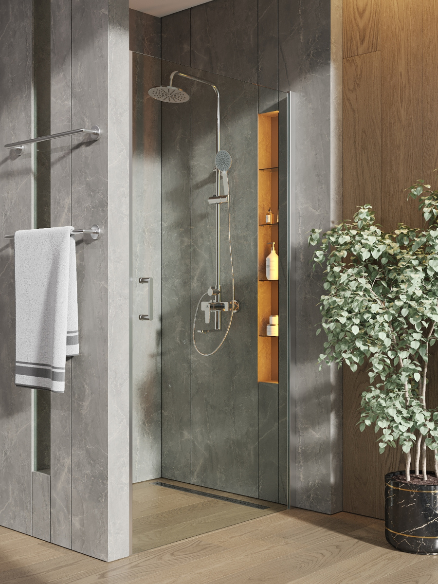 Универсальная распашная душевая дверь Orange E05-100TCR поможет разграничить пространство и организовать душевую зону в определенной части ванной комнаты. Выполнена из прозрачного закаленного стекла толщиной 6 мм, дополнено стекло алюминиевым хромированным профилем, который сочетается с большей частью представленной на рынке сантехники. Модель оборудована подъемным механизмом, который при открывании приподнимает ее автоматически. Габариты 100х190 см.