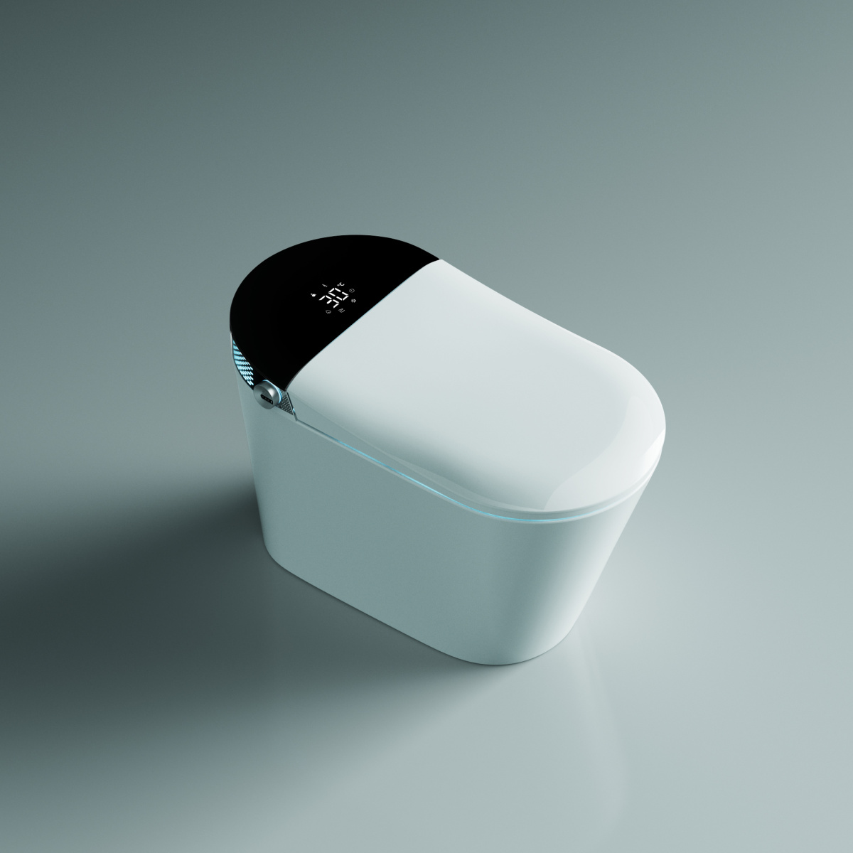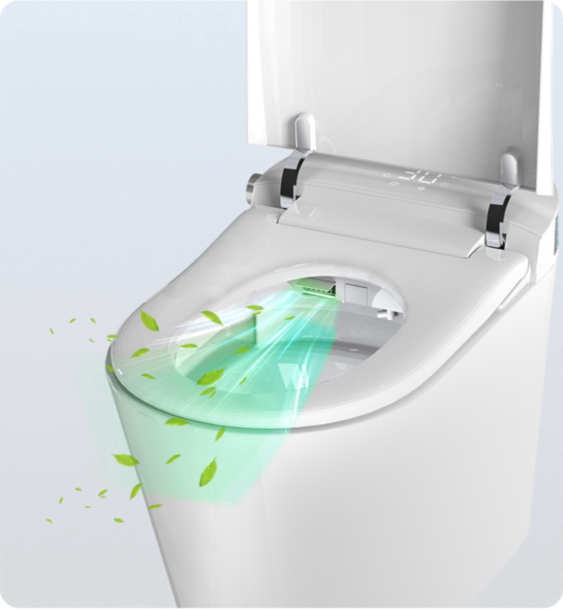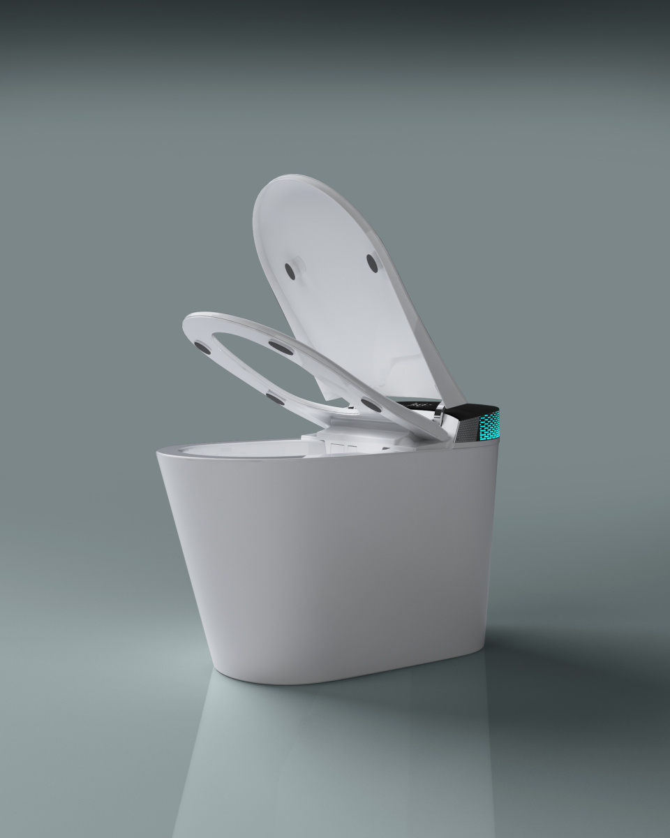 Электронный унитаз оснащен: несколькими функциями биде, самоочишающейся, двигающейся форсункой с настраиваемым напором воды, регулировкой положения, автоматическим открытием крышки, подогревом сиденья, быстрым нагреванием воды, сушкой, регулировкой температуры воды и сушки, регулировкой давления воды, автоматическим смывом, который также работает с отключенным питанием. ДУ пульт управления. Смарт-стикер управления, боковая кнопка управления функциями,встроенное дезодорирование, ночная подсветка, UV стерилизация, антибактериальное покрытие сиденья, LED экран, грязеотталкивающее покрытие глазури Напряжение 110/220V