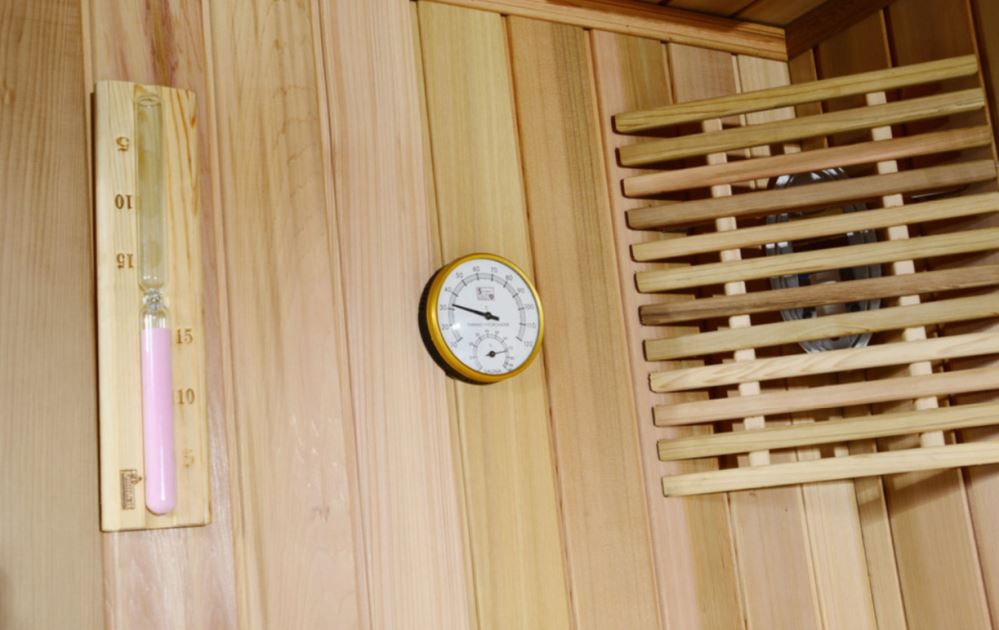 • Финская сауна: печка Harvia, банный камень 20 кг, скамья, гигрометр, песочные часы, абажур, шайка, черпак