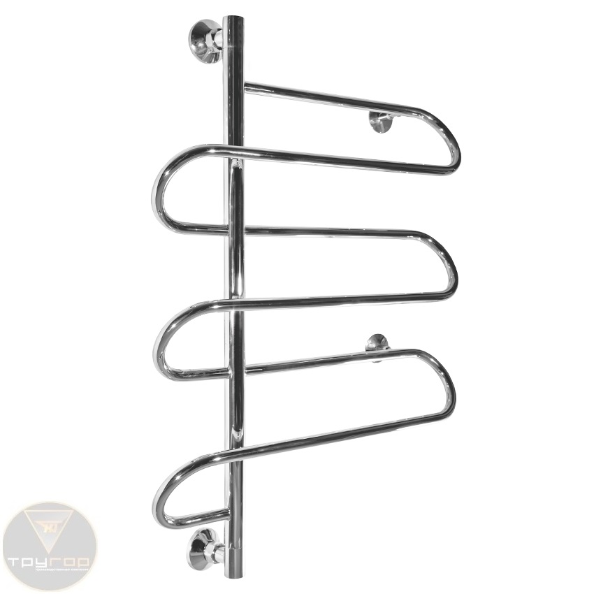 Один центральный коллектор. Змеевик, относительно коллектора сдвинут в сторону. Довольно объемная конфигурация, однако она обеспечивает множество перекладин. Оригинальный дизайн.
