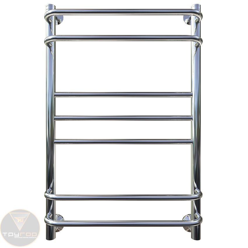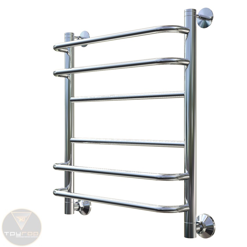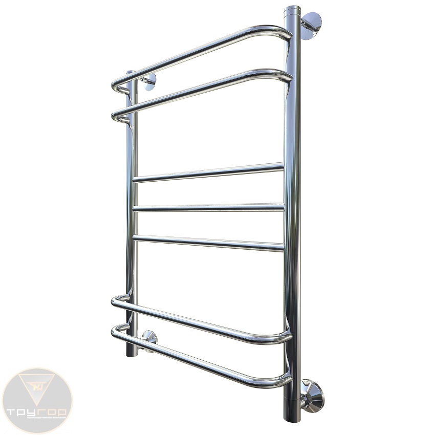 Верхние и нижние перекладины сильно вынесены под прямым углом. Центральные перекладины находятся в одной плоскости с коллекторами. Удобная компановка для просторных ванных комнат.