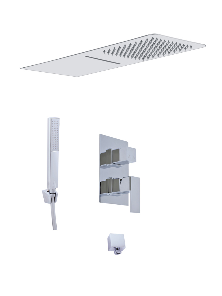 Душевой комплект включает в себя смеситель с трехсторонним керамическим переключателем, фиксированный держатель, ручной душ, шланг и верхний душ с водопадом.