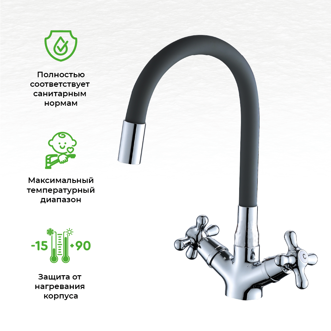 Двухвентильный полимерный смеситель для кухни OneLife P03-007cr - гибкий поворотный излив. Керамические кран-буксы обеспечат легкое управление напором и температурой воды. Вместо привычного латунного сплава он изготовлен из запатентованного высокотехнологичного полимера (выдерживает 510 000 циклов и 53 АТМ без замены изделия после теста на цикличность, исключает возможность обжечься при касании, не подвержен коррозии и окислению, стойкий к отрицательным температурам), что обеспечивает срок службы более 15 лет. Встроенный аэратор экономит воду и, обогащая струю воздухом, делает её мягкой и без брызг. Цвет глянцевый хром, излив матовый черный.