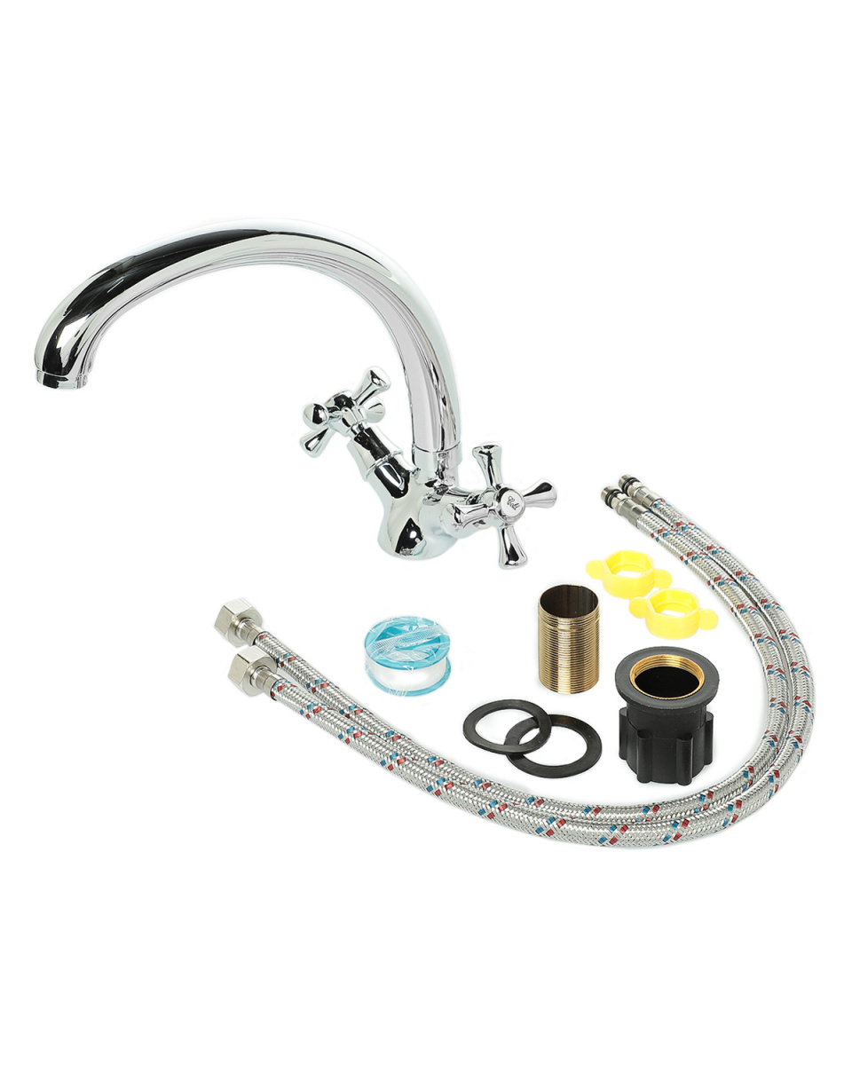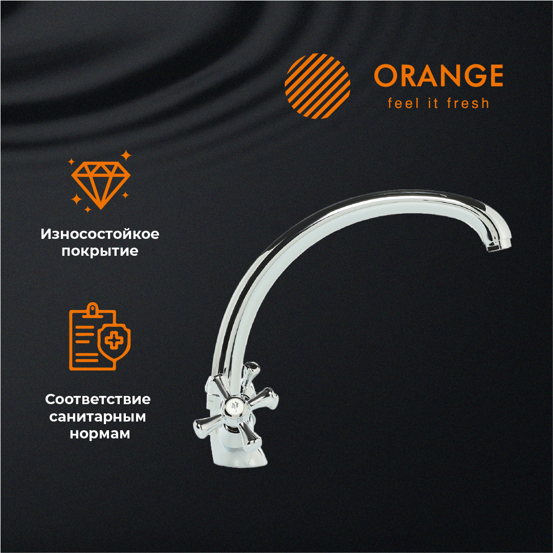 Двухзахватный смеситель для кухни с поворотным изливом Orange Classic Pro. Корпус изделия изготовлен из высококачественной латуни, не подверженной коррозии от длительного контакта с водой. Хромированное покрытие, за которым очень просто ухаживать мягкой салфеткой, обеспечивает блеск поверхности на долгие годы. Аэратор экономит воду и, обогащая струю воздухом, делает её мягкой и без брызг. Фирменные керамические кран-буксы Orange обеспечивают легкое управление напором и температурой воды.