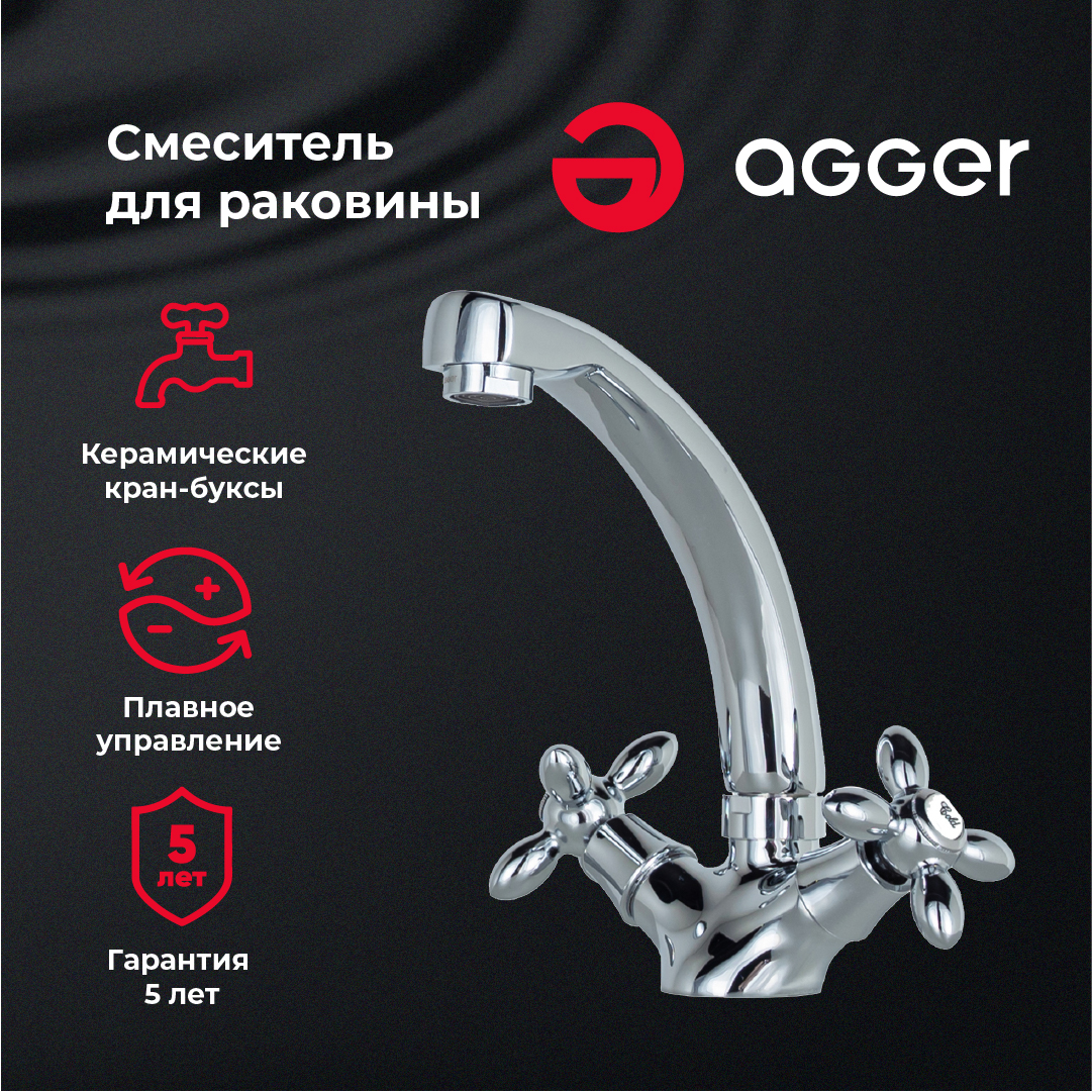 Двухзахватный смеситель для раковины с поворотным изливом Agger Retro – практичность без излишеств. Встроенный аэратор экономит воду, делает струю мягкой и исключает разбрызгивание. Для плавного регулирования напора и температуры воды предусмотрены два надежных вентиля (керамические кран-буксы). Хромовое покрытие, за которым очень просто ухаживать мягкой салфеткой, обеспечивает блеск поверхности на долгие годы.