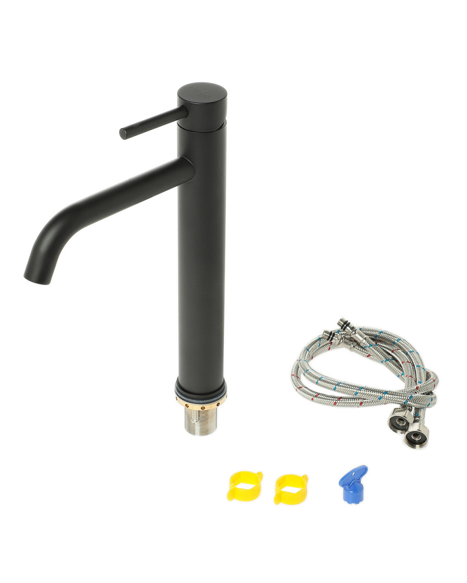 Однозахватный смеситель для раковины с фиксированным изливом Agger Zest гармонично дополнит современный интерьер ванной комнаты. Высокая модель предназначена для использования с накладными раковинами. Для изготовления изделия используется экологичная латунь, а модное на сегодняшний день покрытие в цвете матовый черный, за которым просто ухаживать мягкой салфеткой, нанесено методом порошковой окраски с многоступенчатой системой подготовки и высокотемпературной обработкой. Включение воды и регулирование температуры осуществляется при помощи удобного джойстика (керамический картридж). Встроенный в излив аэратор насыщает воду воздухом, делая струю равномерной и мягкой.