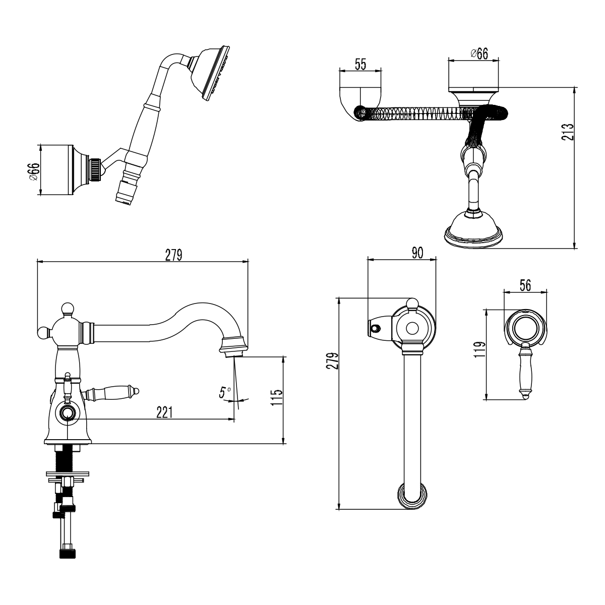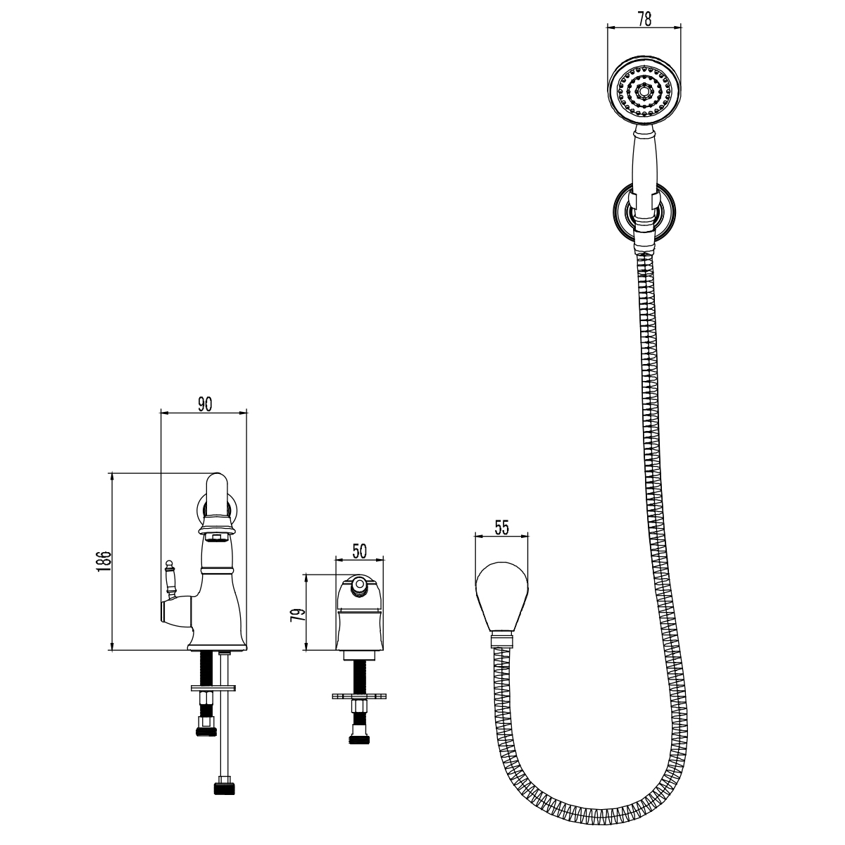 • Аксессуары в комплекте (1-функциональная лейка Ø78х215 мм, настенное поворотное крепление для лейки, подключение душевого шланга, душевой шланг 2 м)