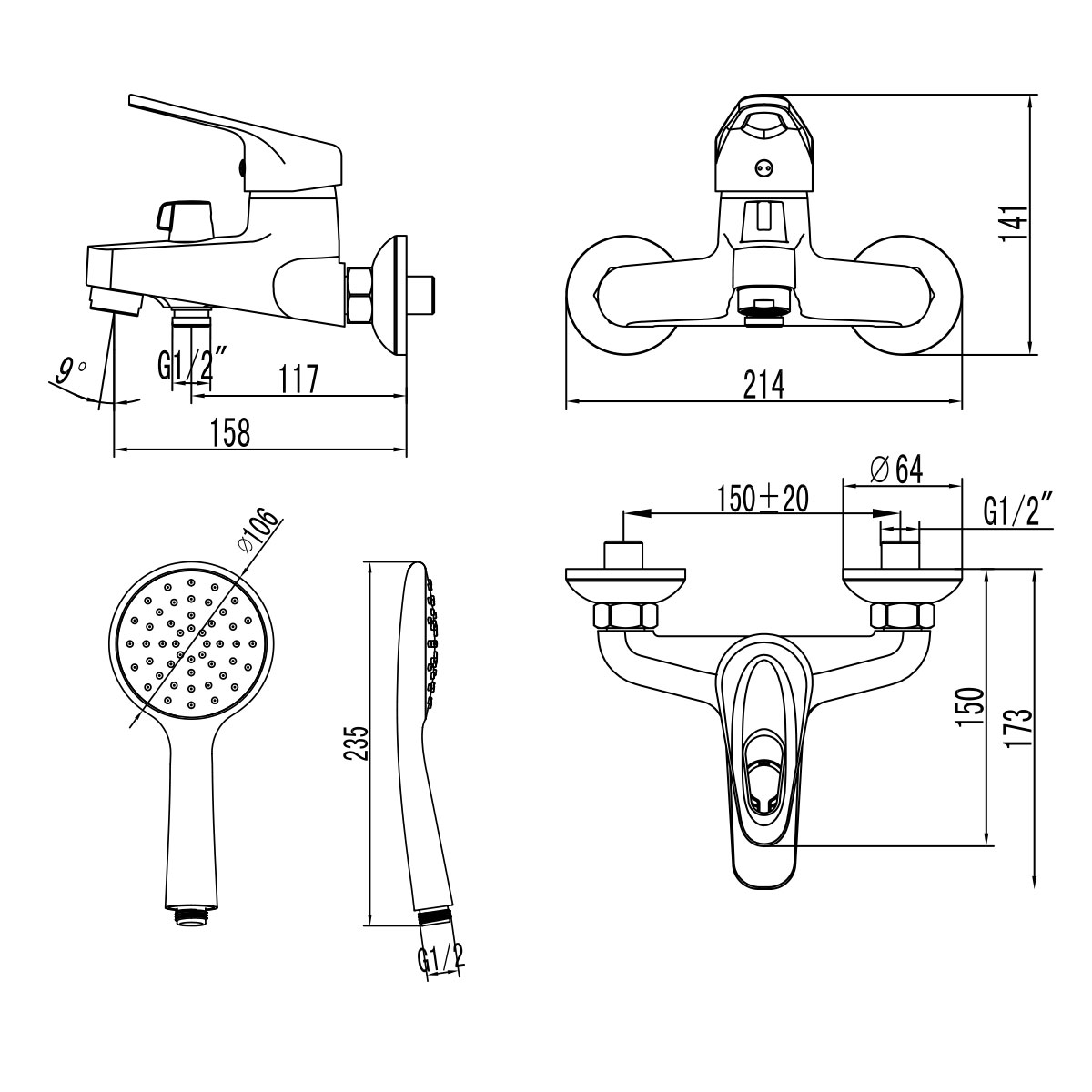 • Аксессуары в комплекте: шланг 1,5 м, настенное поворотное крепление, 1-функциональная лейка Ø106x235 мм
