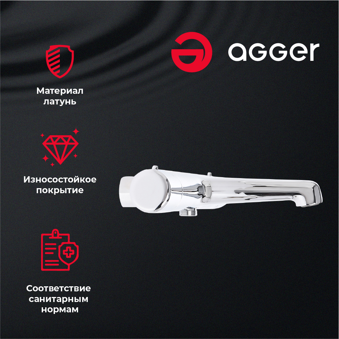 Термостат для ванны/душа с фиксированным изливом Agger Thermo прекрасно дополнит современный интерьер ванной комнаты. Управление происходит с помощью двух ручек: левая регулирует напор воды и его переключение на излив/душ, а правая отвечает за температуру. Корпус выполнен из высококачественной латуни, не подверженной коррозии от длительного контакта с водой. Хромированное покрытие, за которым очень просто ухаживать мягкой салфеткой, подарит блеск поверхности на долгие годы. Фирменный термостатический картридж Agger обеспечит легкое управление напором и температурой воды. Встроенный аэратор экономит воду и, обогащая струю воздухом, делает её мягкой и без брызг.