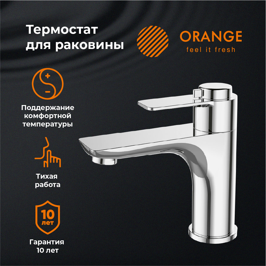 Термостат для раковины с фиксированным изливом Orange Thermo станет украшением ванной комнаты. Он контролирует и поддерживает температуру воды во время работы за счет смешивания горячих и холодных потоков в нужных пропорциях. Изготовлен из латуни и не подвержен коррозии от постоянного контакта с водой. Фирменный термостатический картридж Orange делает лёгким управление напором и температурой воды. Покрытие в цвете глянцевый хром, за которым очень просто ухаживать мягкой салфеткой, обеспечивает блеск поверхности. Аэратор экономит воду и, обогащая струю воздухом, делает её мягкой, без брызг. Подключение горячей воды - слева, холодной - справа.