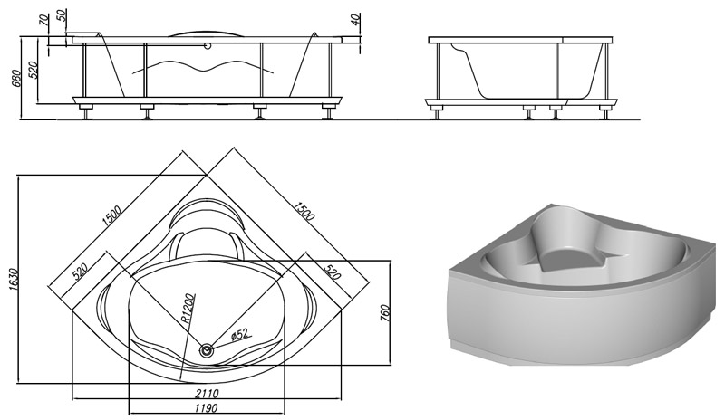 Комплектация BASIS (ванна + слив-перелив + каркас + индивидуальная упаковка) РАЗМЕР: 150 x 150 x 52.2 (67) ОБЪЕМ: 375 л.