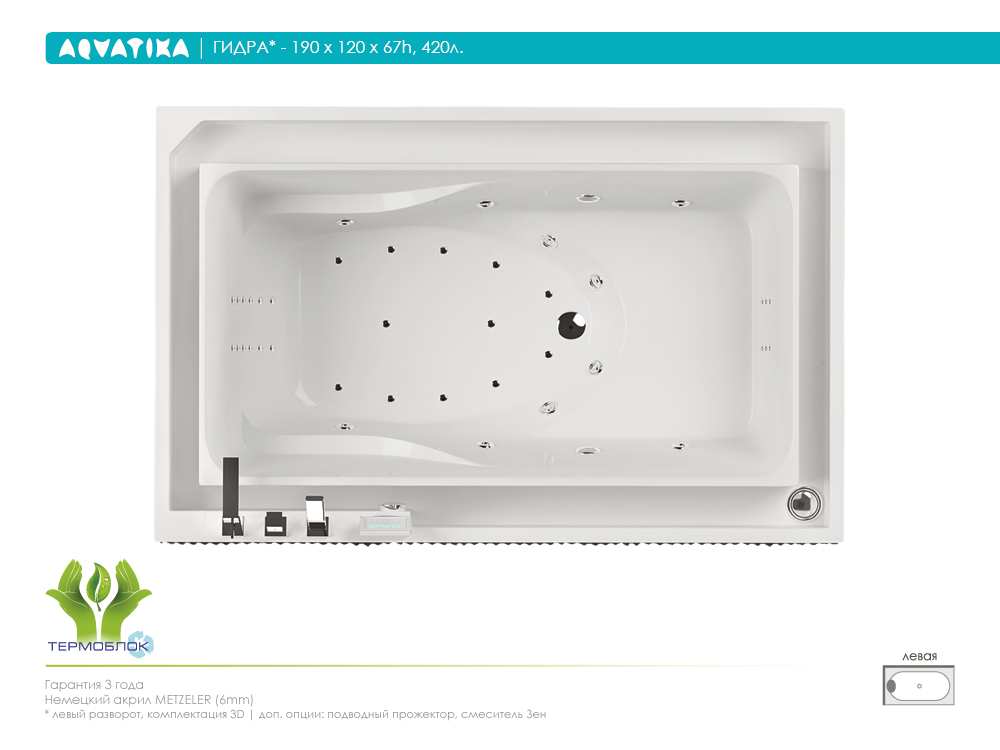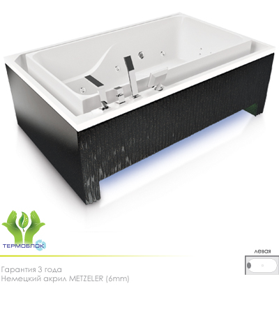 гидромассаж (сенсорное управление, 6 форсунок), аэромассаж (12 форсунок), спинной массаж (12 форсунок), кран Турбо, рама, слив-перелив.