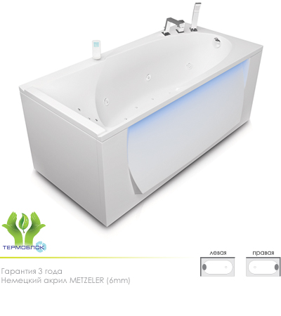 гидромассаж (сенсорное управление, 6 форсунок), аэромассаж (10 форсунок), спинной массаж (12 форсунок), кран Турбо, рама, слив-перелив